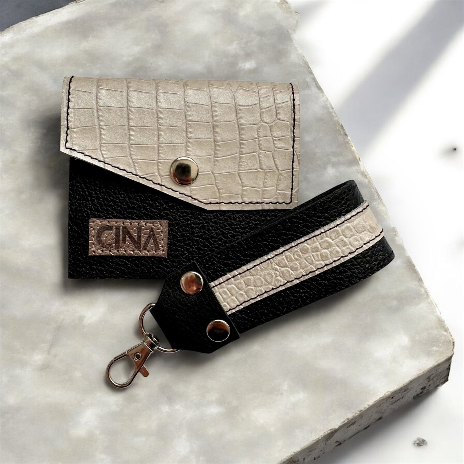 Set portaocumento + llavero (negro y blanco croco)